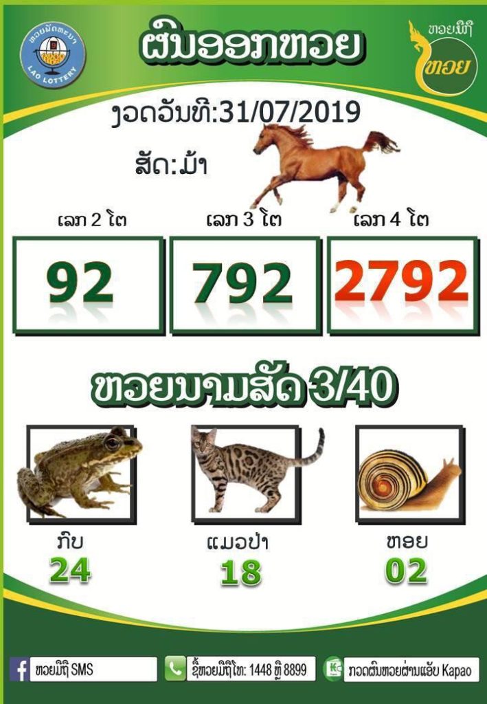 จะได้เงิน 4,000 กีบ หรือประมาณ 147 บาท - รางวัลนามสัตว์ 3 ชนิด ค่าตอบแทน 2,000 เท่าของจำนวนเงินที่ซื้อ เช่น ซื้อ 2,000 กีบ ก็ให้เอา 2000* 2,000